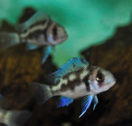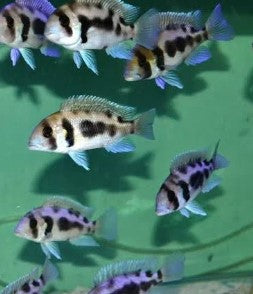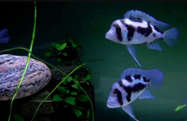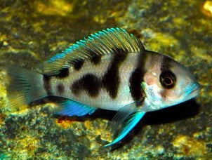 One of the most iconic and recognizable Rift Lake Cichlids, the Frontosa is a striking, large growing species originating from the waters of Lake Tanganyika. The Black Widow Frontosa is a selectively bred form with unique patterning differing from the wild-type vertical barring.